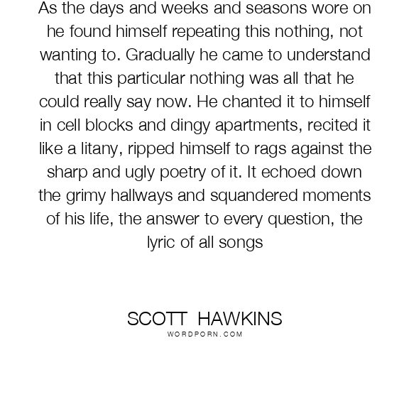 As the days and weeks and seasons wore on he found himself repeating this nothing, not wanting to. Gradually he came to understand that this particular nothing was all that he could really say now. He chanted it to himself in cell blocks and dingy apartments, recited it like a litany, ripped himself to rags against the sharp and ugly poetry of it. It echoed down the grimy hallways and squandered moments of his life, the answer to every question, the lyric of all songs
