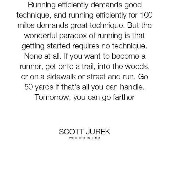 Running efficiently demands good technique, and running efficiently for 100 miles demands great technique. But the wonderful paradox of running is that getting started requires no technique. None at all. If you want to become a runner, get onto a trail, into the woods, or on a sidewalk or street and run. Go 50 yards if that's all you can handle. Tomorrow, you can go farther