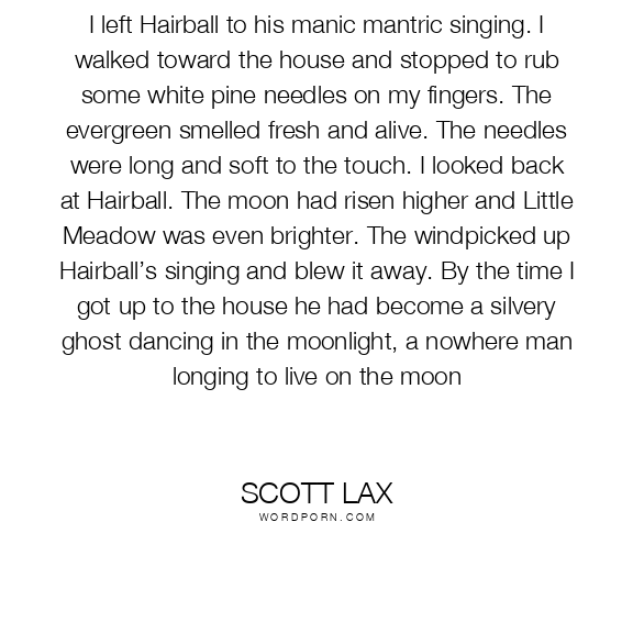I left Hairball to his manic mantric singing. I walked toward the house and stopped to rub some white pine needles on my fingers. The evergreen smelled fresh and alive. The needles were long and soft to the touch. I looked back at Hairball. The moon had risen higher and Little Meadow was even brighter. The windpicked up Hairball’s singing and blew it away. By the time I got up to the house he had become a silvery ghost dancing in the moonlight, a nowhere man longing to live on the moon