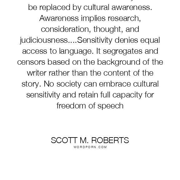 I maintain that cultural sensitivity should be replaced by cultural awareness. Awareness implies research, consideration, thought, and judiciousness....Sensitivity denies equal access to language. It segregates and censors based on the background of the writer rather than the content of the story. No society can embrace cultural sensitivity and retain full capacity for freedom of speech