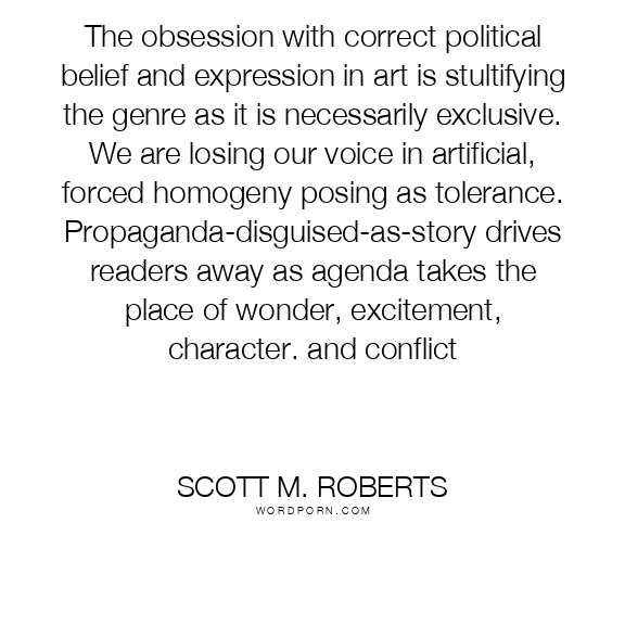 The obsession with correct political belief and expression in art is stultifying the genre as it is necessarily exclusive. We are losing our voice in artificial, forced homogeny posing as tolerance. Propaganda-disguised-as-story drives readers away as agenda takes the place of wonder, excitement, character. and conflict
