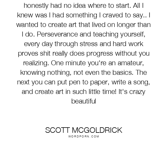 scott mcgoldrick quote. I had zero idea of what I was doing.. I honestly had no idea where to start. All I knew was I had something I craved to say.. I wanted to create art that lived on longer than I do. Perseverance and teaching yourself, every day through stress and hard work proves shit really does progress without you realizing. One minute you're an amateur, knowing nothing, not even the basics. The next you can put pen to paper, write a song, and create art in such little time! It's crazy beautiful