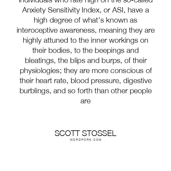 Individuals who rate high on the so-called Anxiety Sensitivity Index, or ASI, have a high degree of what's known as interoceptive awareness, meaning they are highly attuned to the inner workings on their bodies, to the beepings and bleatings, the blips and burps, of their physiologies; they are more conscious of their heart rate, blood pressure, digestive burblings, and so forth than other people are