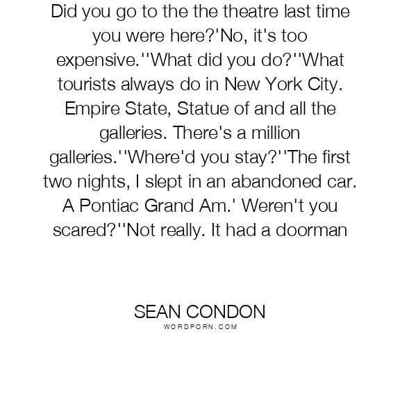 Did you go to the the theatre last time you were here?'No, it's too expensive.''What did you do?''What tourists always do in New York City. Empire State, Statue of and all the galleries. There's a million galleries.''Where'd you stay?''The first two nights, I slept in an abandoned car. A Pontiac Grand Am.' Weren't you scared?''Not really. It had a doorman