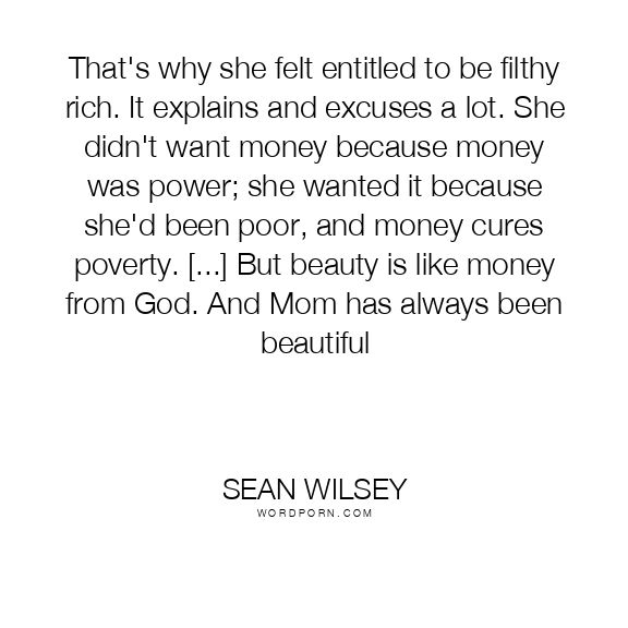 That's why she felt entitled to be filthy rich. It explains and excuses a lot. She didn't want money because money was power; she wanted it because she'd been poor, and money cures poverty. [...] But beauty is like money from God. And Mom has always been beautiful