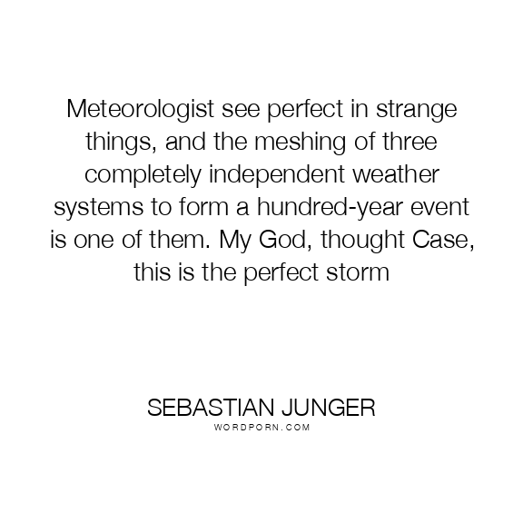 Meteorologist see perfect in strange things, and the meshing of three completely independent weather systems to form a hundred-year event is one of them. My God, thought Case, this is the perfect storm