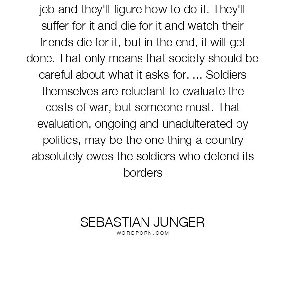Society can give its young men almost any job and they'll figure how to do it. They'll suffer for it and die for it and watch their friends die for it, but in the end, it will get done. That only means that society should be careful about what it asks for. ... Soldiers themselves are reluctant to evaluate the costs of war, but someone must. That evaluation, ongoing and unadulterated by politics, may be the one thing a country absolutely owes the soldiers who defend its borders