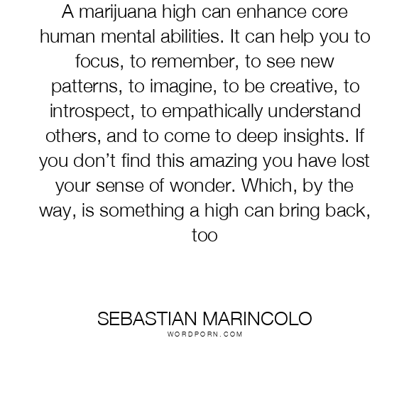A marijuana high can enhance core human mental abilities. It can help you to focus, to remember, to see new patterns, to imagine, to be creative, to introspect, to empathically understand others, and to come to deep insights. If you don’t find this amazing you have lost your sense of wonder. Which, by the way, is something a high can bring back, too