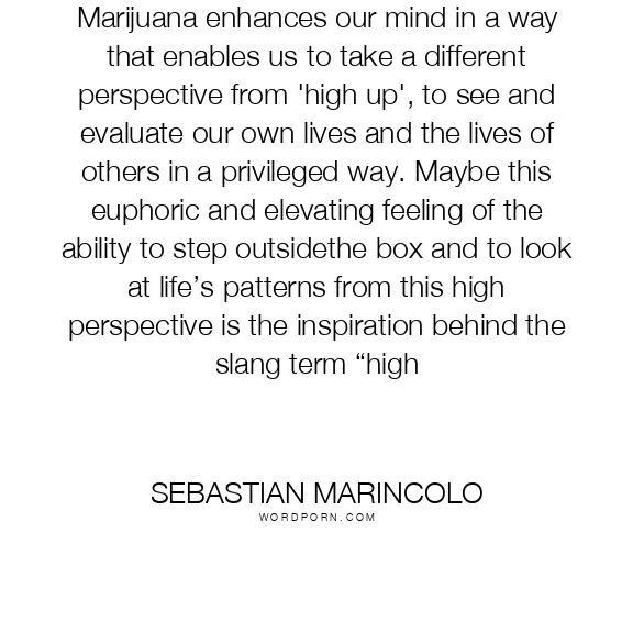 Marijuana enhances our mind in a way that enables us to take a different perspective from 'high up', to see and evaluate our own lives and the lives of others in a privileged way. Maybe this euphoric and elevating feeling of the ability to step outsidethe box and to look at life’s patterns from this high perspective is the inspiration behind the slang term “high