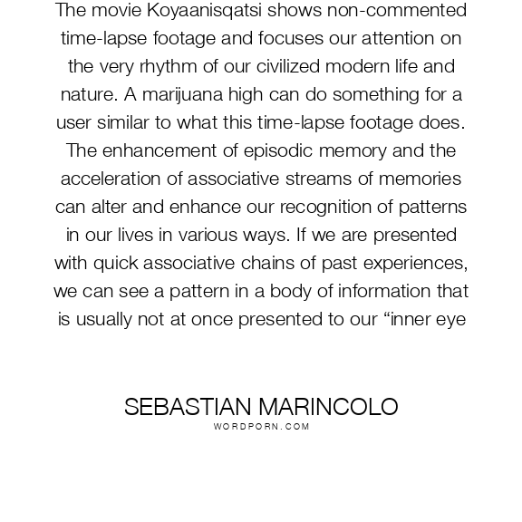 The movie Koyaanisqatsi shows non-commented time-lapse footage and focuses our attention on the very rhythm of our civilized modern life and nature. A marijuana high can do something for a user similar to what this time-lapse footage does. The enhancement of episodic memory and the acceleration of associative streams of memories can alter and enhance our recognition of patterns in our lives in various ways. If we are presented with quick associative chains of past experiences, we can see a pattern in a body of information that is usually not at once presented to our “inner eye