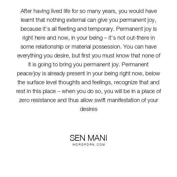 After having lived life for so many years, you would have learnt that nothing external can give you permanent joy, because it’s all fleeting and temporary. Permanent joy is right here and now, in your being – it’s not out-there in some relationship or material possession. You can have everything you desire, but first you must know that none of it is going to bring you permanent joy. Permanent peace/joy is already present in your being right now, below the surface level thoughts and feelings, recognize that and rest in this place – when you do so, you will be in a place of zero resistance and thus allow swift manifestation of your desires