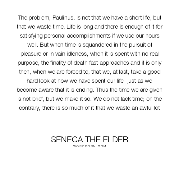 The problem, Paulinus, is not that we have a short life, but that we waste time. Life is long and there is enough of it for satisfying personal accomplishments if we use our hours well. But when time is squandered in the pursuit of pleasure or in vain idleness, when it is spent with no real purpose, the finality of death fast approaches and it is only then, when we are forced to, that we, at last, take a good hard look at how we have spent our life- just as we become aware that it is ending. Thus the time we are given is not brief, but we make it so. We do not lack time; on the contrary, there is so much of it that we waste an awful lot