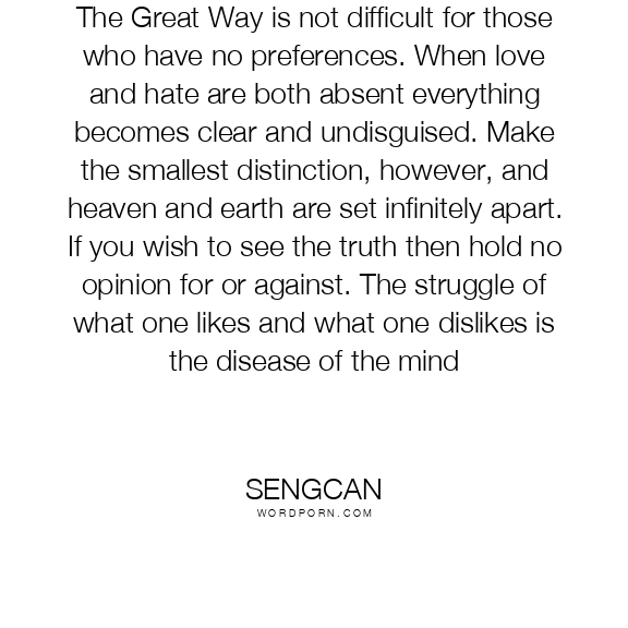 The Great Way is not difficult for those who have no preferences. When love and hate are both absent everything becomes clear and undisguised. Make the smallest distinction, however, and heaven and earth are set infinitely apart. If you wish to see the truth then hold no opinion for or against. The struggle of what one likes and what one dislikes is the disease of the mind