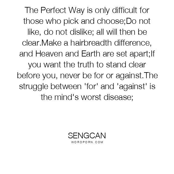 The Perfect Way is only difficult for those who pick and choose;Do not like, do not dislike; all will then be clear.Make a hairbreadth difference, and Heaven and Earth are set apart;If you want the truth to stand clear before you, never be for or against.The struggle between 'for' and 'against' is the mind's worst disease;