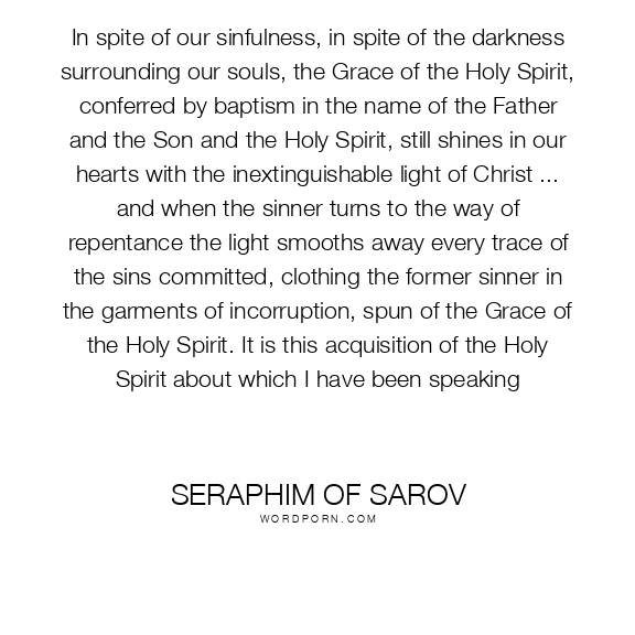 In spite of our sinfulness, in spite of the darkness surrounding our souls, the Grace of the Holy Spirit, conferred by baptism in the name of the Father and the Son and the Holy Spirit, still shines in our hearts with the inextinguishable light of Christ ... and when the sinner turns to the way of repentance the light smooths away every trace of the sins committed, clothing the former sinner in the garments of incorruption, spun of the Grace of the Holy Spirit. It is this acquisition of the Holy Spirit about which I have been speaking
