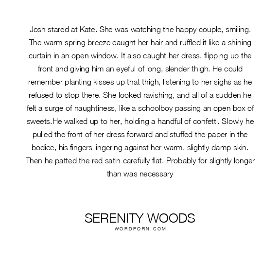 Josh stared at Kate. She was watching the happy couple, smiling. The warm spring breeze caught her hair and ruffled it like a shining curtain in an open window. It also caught her dress, flipping up the front and giving him an eyeful of long, slender thigh. He could remember planting kisses up that thigh, listening to her sighs as he refused to stop there. She looked ravishing, and all of a sudden he felt a surge of naughtiness, like a schoolboy passing an open box of sweets.He walked up to her, holding a handful of confetti. Slowly he pulled the front of her dress forward and stuffed the paper in the bodice, his fingers lingering against her warm, slightly damp skin. Then he patted the red satin carefully flat. Probably for slightly longer than was necessary
