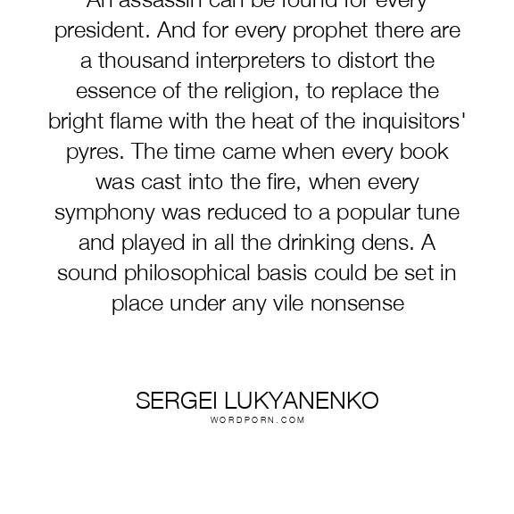 An assassin can be found for every president. And for every prophet there are a thousand interpreters to distort the essence of the religion, to replace the bright flame with the heat of the inquisitors' pyres. The time came when every book was cast into the fire, when every symphony was reduced to a popular tune and played in all the drinking dens. A sound philosophical basis could be set in place under any vile nonsense