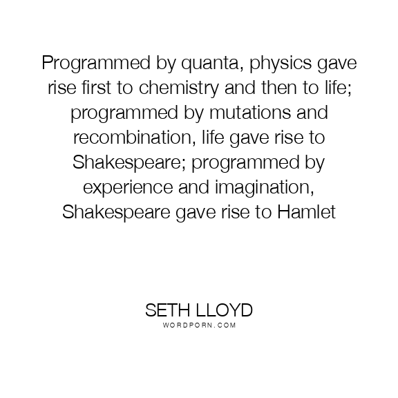 Programmed by quanta, physics gave rise first to chemistry and then to life; programmed by mutations and recombination, life gave rise to Shakespeare; programmed by experience and imagination, Shakespeare gave rise to Hamlet