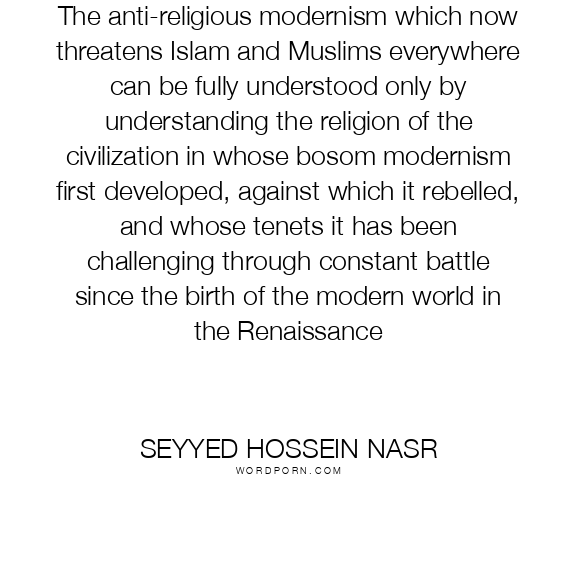 The anti-religious modernism which now threatens Islam and Muslims everywhere can be fully understood only by understanding the religion of the civilization in whose bosom modernism first developed, against which it rebelled, and whose tenets it has been challenging through constant battle since the birth of the modern world in the Renaissance