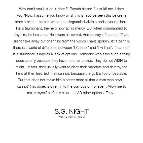 Why don't you just do it, then?" Racath hissed. "Just kill me. I dare you."Now, I assume you know what this is. You've seen this before in other stories - the part where the disgruntled villain stands over the hero. He is triumphant, the hero now at his mercy. But when commanded to slay him, he hesitates. He lowers his sword. And he says: "I cannot."If you are to take away but one thing from the words I have spoken, let it be this: there is a world of difference between "I Cannot" and "I will not". "I cannot" is a surrender. It implies a lack of options. Someone who says such a thing does so only because they have no other choice. They do not WISH to relent - in fact, they usually want to obey their mandate and destroy the hero at their feet. But they cannot, because the guilt is too unbearable. But that does not make him a better man; all that a man who says "I cannot" has done, is given in to the compulsion to repent.Allow me to make myself perfectly clear - I HAD other options. Easy options. Simple options. I could have killed Racath Thanjel that day. I could have killed him and all the others, too. I could have left them dead and bloody on that grassy hill, and gone trotting back to the Imperator's lap. I could have shrugged off the attrition that had dogged my every step, thought better of my disenssion, given up on all hope of absolution and accepted my damnation. And I could have spent the rest of eternity destroying God's green earth at Lavethion's side.I could have. It would have been so easy. So simple. So wrong. And I didn't want to.And so I took a sickened step away. Stabbed Osveta into the grass. Shook my head. And said: "I won't