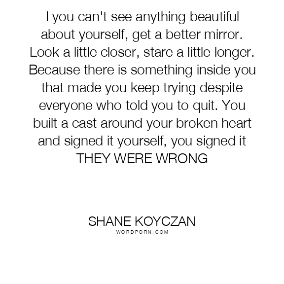 I you can't see anything beautiful about yourself, get a better mirror. Look a little closer, stare a little longer. Because there is something inside you that made you keep trying despite everyone who told you to quit. You built a cast around your broken heart and signed it yourself, you signed it THEY WERE WRONG