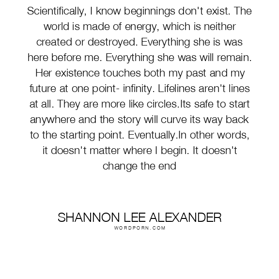 Scientifically, I know beginnings don't exist. The world is made of energy, which is neither created or destroyed. Everything she is was here before me. Everything she was will remain. Her existence touches both my past and my future at one point- infinity. Lifelines aren't lines at all. They are more like circles.Its safe to start anywhere and the story will curve its way back to the starting point. Eventually.In other words, it doesn't matter where I begin. It doesn't change the end