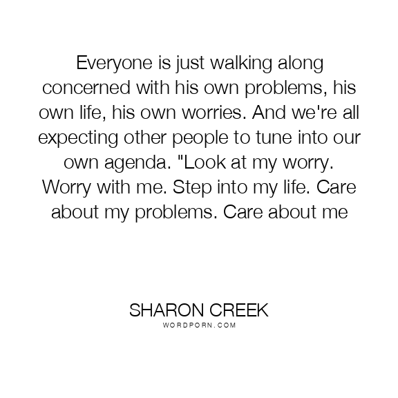Everyone is just walking along concerned with his own problems, his own life, his own worries. And we're all expecting other people to tune into our own agenda. "Look at my worry. Worry with me. Step into my life. Care about my problems. Care about me