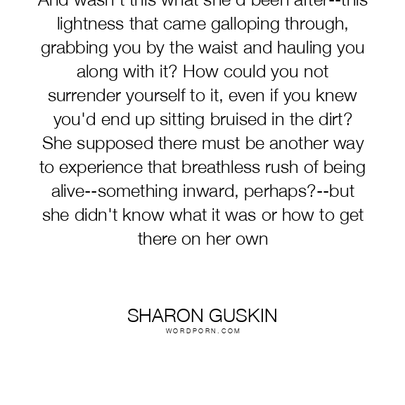 And wasn't this what she'd been after--this lightness that came galloping through, grabbing you by the waist and hauling you along with it? How could you not surrender yourself to it, even if you knew you'd end up sitting bruised in the dirt? She supposed there must be another way to experience that breathless rush of being alive--something inward, perhaps?--but she didn't know what it was or how to get there on her own