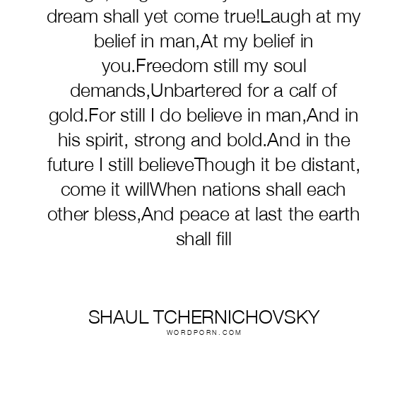 Laugh, laugh at all my dreams!What I dream shall yet come true!Laugh at my belief in man,At my belief in you.Freedom still my soul demands,Unbartered for a calf of gold.For still I do believe in man,And in his spirit, strong and bold.And in the future I still believeThough it be distant, come it willWhen nations shall each other bless,And peace at last the earth shall fill