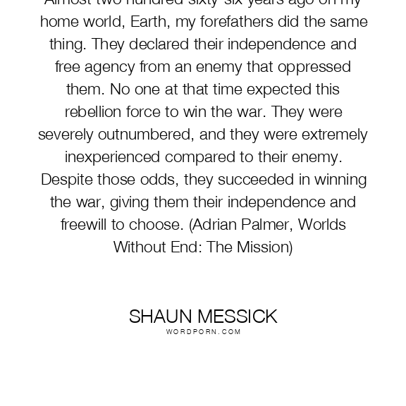 Almost two hundred sixty-six years ago on my home world, Earth, my forefathers did the same thing. They declared their independence and free agency from an enemy that oppressed them. No one at that time expected this rebellion force to win the war. They were severely outnumbered, and they were extremely inexperienced compared to their enemy. Despite those odds, they succeeded in winning the war, giving them their independence and freewill to choose. (Adrian Palmer, Worlds Without End: The Mission)
