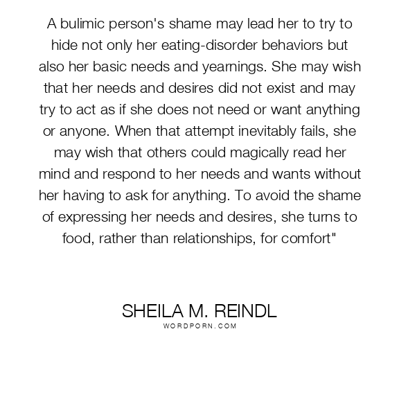 A bulimic person's shame may lead her to try to hide not only her eating-disorder behaviors but also her basic needs and yearnings. She may wish that her needs and desires did not exist and may try to act as if she does not need or want anything or anyone. When that attempt inevitably fails, she may wish that others could magically read her mind and respond to her needs and wants without her having to ask for anything. To avoid the shame of expressing her needs and desires, she turns to food, rather than relationships, for comfort"