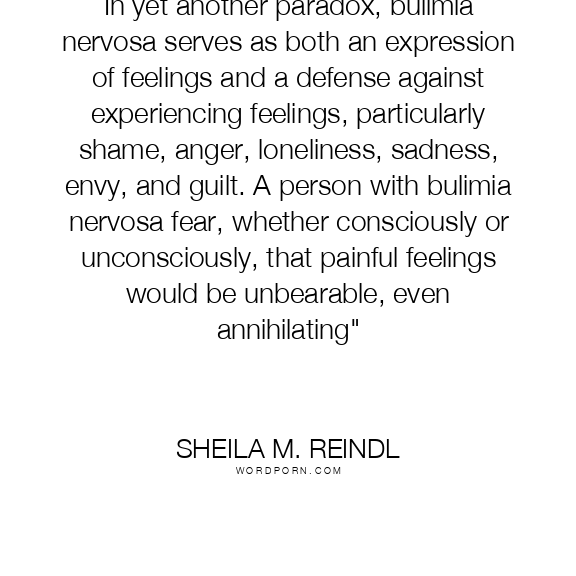 In yet another paradox, bulimia nervosa serves as both an expression of feelings and a defense against experiencing feelings, particularly shame, anger, loneliness, sadness, envy, and guilt. A person with bulimia nervosa fear, whether consciously or unconsciously, that painful feelings would be unbearable, even annihilating"