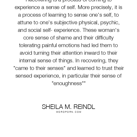 Recovering is a process of coming to experience a sense of self. More precisely, it is a process of learning to sense one's self, to attune to one's subjective physical, psychic, and social self- experience. These woman's core sense of shame and their difficulty tolerating painful emotions had led them to avoid turning their attention inward to their internal sense of things. In recovering, they "came to their senses" and learned to trust their sensed experience, in particular their sense of "enoughness""