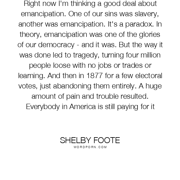 Right now I'm thinking a good deal about emancipation. One of our sins was slavery, another was emancipation. It's a paradox. In theory, emancipation was one of the glories of our democracy - and it was. But the way it was done led to tragedy, turning four million people loose with no jobs or trades or learning. And then in 1877 for a few electoral votes, just abandoning them entirely. A huge amount of pain and trouble resulted. Everybody in America is still paying for it