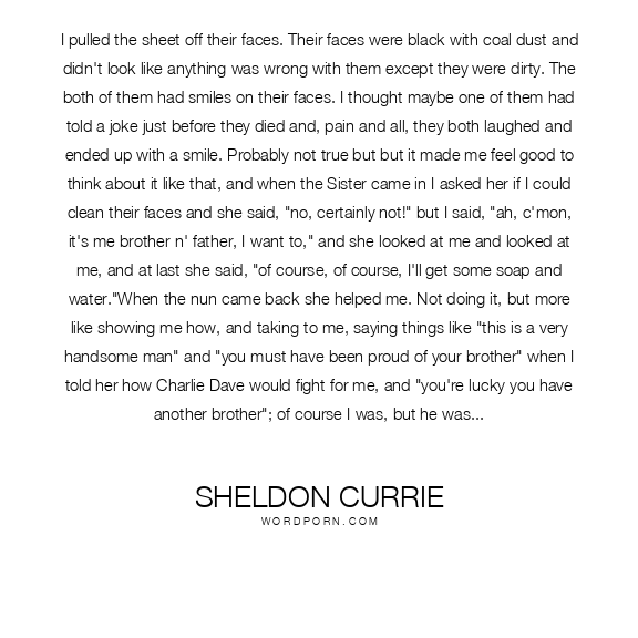 I pulled the sheet off their faces. Their faces were black with coal dust and didn't look like anything was wrong with them except they were dirty. The both of them had smiles on their faces. I thought maybe one of them had told a joke just before they died and, pain and all, they both laughed and ended up with a smile. Probably not true but but it made me feel good to think about it like that, and when the Sister came in I asked her if I could clean their faces and she said, "no, certainly not!" but I said, "ah, c'mon, it's me brother n' father, I want to," and she looked at me and looked at me, and at last she said, "of course, of course, I'll get some soap and water."When the nun came back she helped me. Not doing it, but more like showing me how, and taking to me, saying things like "this is a very handsome man" and "you must have been proud of your brother" when I told her how Charlie Dave would fight for me, and "you're lucky you have another brother"; of course I was, but he was younger and might change, but she talked to me and made it all seem normal, the two of us standing over a dead face and cleaning the grit away. The only other thing I remember a nun ever saying to me was, "Mairead, you get to your seat, this minute!