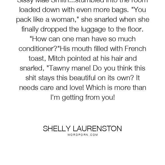 Sissy Mae Smith...stumbled into the room loaded down with even more bags. "You pack like a woman," she snarled when she finally dropped the luggage to the floor. "How can one man have so much conditioner?"His mouth filled with French toast, Mitch pointed at his hair and snarled, "Tawny mane! Do you think this shit stays this beautiful on its own? It needs care and love! Which is more than I'm getting from you!