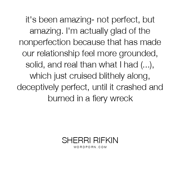 it's been amazing- not perfect, but amazing. I'm actually glad of the nonperfection because that has made our relationship feel more grounded, solid, and real than what I had (...), which just cruised blithely along, deceptively perfect, until it crashed and burned in a fiery wreck