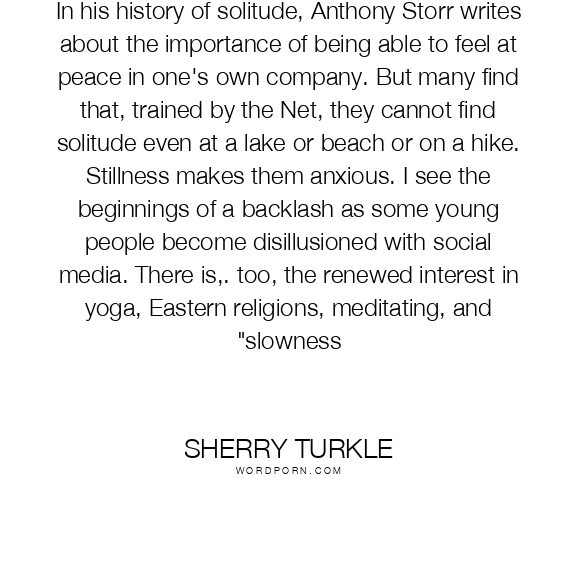 In his history of solitude, Anthony Storr writes about the importance of being able to feel at peace in one's own company. But many find that, trained by the Net, they cannot find solitude even at a lake or beach or on a hike. Stillness makes them anxious. I see the beginnings of a backlash as some young people become disillusioned with social media. There is,. too, the renewed interest in yoga, Eastern religions, meditating, and "slowness