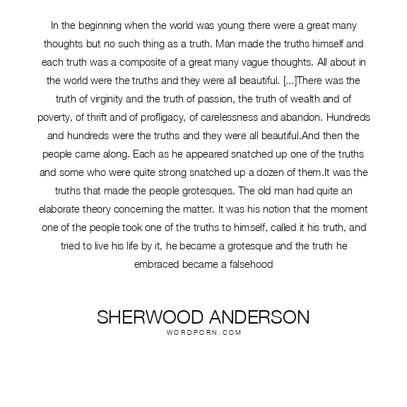 In the beginning when the world was young there were a great many thoughts but no such thing as a truth. Man made the truths himself and each truth was a composite of a great many vague thoughts. All about in the world were the truths and they were all beautiful. [...]There was the truth of virginity and the truth of passion, the truth of wealth and of poverty, of thrift and of profligacy, of carelessness and abandon. Hundreds and hundreds were the truths and they were all beautiful.And then the people came along. Each as he appeared snatched up one of the truths and some who were quite strong snatched up a dozen of them.It was the truths that made the people grotesques. The old man had quite an elaborate theory concerning the matter. It was his notion that the moment one of the people took one of the truths to himself, called it his truth, and tried to live his life by it, he became a grotesque and the truth he embraced became a falsehood
