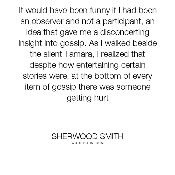 It would have been funny if I had been an observer and not a participant, an idea that gave me a disconcerting insight into gossip. As I walked beside the silent Tamara, I realized that despite how entertaining certain stories were, at the bottom of every item of gossip there was someone getting hurt