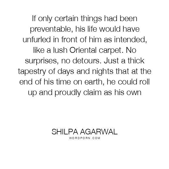 If only certain things had been preventable, his life would have unfurled in front of him as intended, like a lush Oriental carpet. No surprises, no detours. Just a thick tapestry of days and nights that at the end of his time on earth, he could roll up and proudly claim as his own