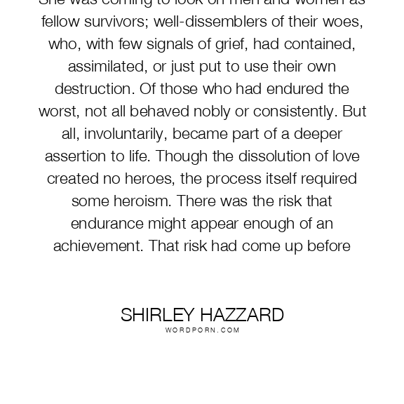 She was coming to look on men and women as fellow survivors; well-dissemblers of their woes, who, with few signals of grief, had contained, assimilated, or just put to use their own destruction. Of those who had endured the worst, not all behaved nobly or consistently. But all, involuntarily, became part of a deeper assertion to life. Though the dissolution of love created no heroes, the process itself required some heroism. There was the risk that endurance might appear enough of an achievement. That risk had come up before