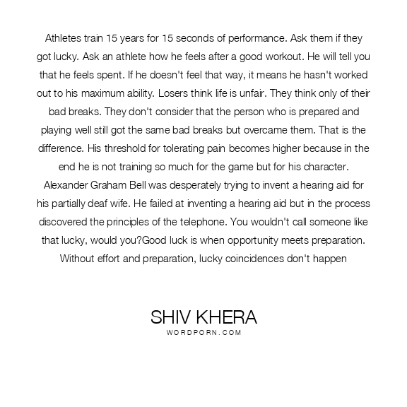 Athletes train 15 years for 15 seconds of performance. Ask them if they got lucky. Ask an athlete how he feels after a good workout. He will tell you that he feels spent. If he doesn't feel that way, it means he hasn't worked out to his maximum ability. Losers think life is unfair. They think only of their bad breaks. They don't consider that the person who is prepared and playing well still got the same bad breaks but overcame them. That is the difference. His threshold for tolerating pain becomes higher because in the end he is not training so much for the game but for his character. Alexander Graham Bell was desperately trying to invent a hearing aid for his partially deaf wife. He failed at inventing a hearing aid but in the process discovered the principles of the telephone. You wouldn't call someone like that lucky, would you?Good luck is when opportunity meets preparation. Without effort and preparation, lucky coincidences don't happen