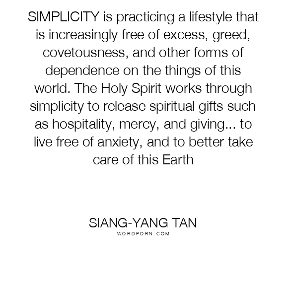SIMPLICITY is practicing a lifestyle that is increasingly free of excess, greed, covetousness, and other forms of dependence on the things of this world. The Holy Spirit works through simplicity to release spiritual gifts such as hospitality, mercy, and giving... to live free of anxiety, and to better take care of this Earth