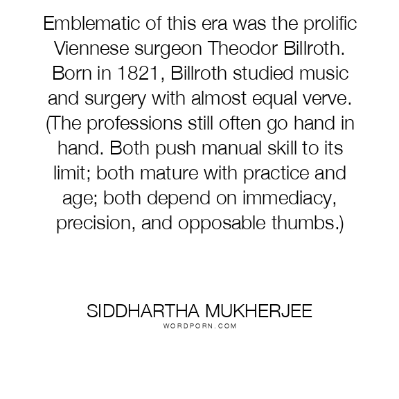 Emblematic of this era was the prolific Viennese surgeon Theodor Billroth. Born in 1821, Billroth studied music and surgery with almost equal verve. (The professions still often go hand in hand. Both push manual skill to its limit; both mature with practice and age; both depend on immediacy, precision, and opposable thumbs.)