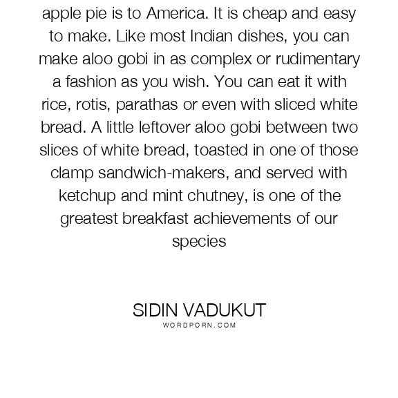 The aloo gobi is perhaps to North India what apple pie is to America. It is cheap and easy to make. Like most Indian dishes, you can make aloo gobi in as complex or rudimentary a fashion as you wish. You can eat it with rice, rotis, parathas or even with sliced white bread. A little leftover aloo gobi between two slices of white bread, toasted in one of those clamp sandwich-makers, and served with ketchup and mint chutney, is one of the greatest breakfast achievements of our species