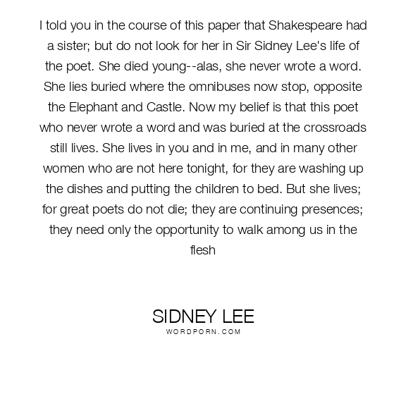 I told you in the course of this paper that Shakespeare had a sister; but do not look for her in Sir Sidney Lee's life of the poet. She died young--alas, she never wrote a word. She lies buried where the omnibuses now stop, opposite the Elephant and Castle. Now my belief is that this poet who never wrote a word and was buried at the crossroads still lives. She lives in you and in me, and in many other women who are not here tonight, for they are washing up the dishes and putting the children to bed. But she lives; for great poets do not die; they are continuing presences; they need only the opportunity to walk among us in the flesh