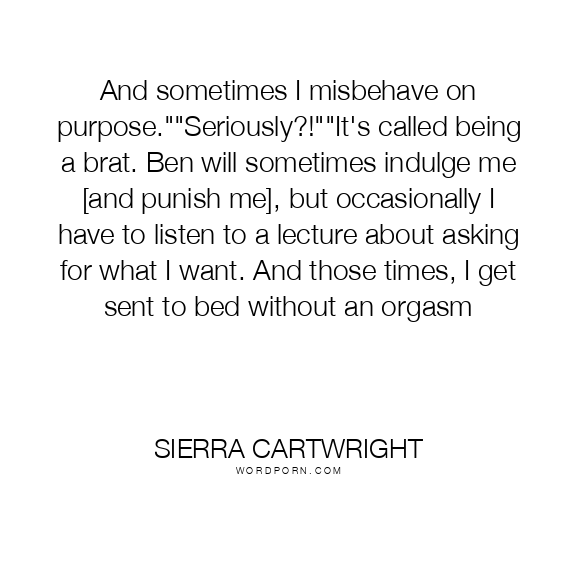 And sometimes I misbehave on purpose.""Seriously?!""It's called being a brat. Ben will sometimes indulge me [and punish me], but occasionally I have to listen to a lecture about asking for what I want. And those times, I get sent to bed without an orgasm