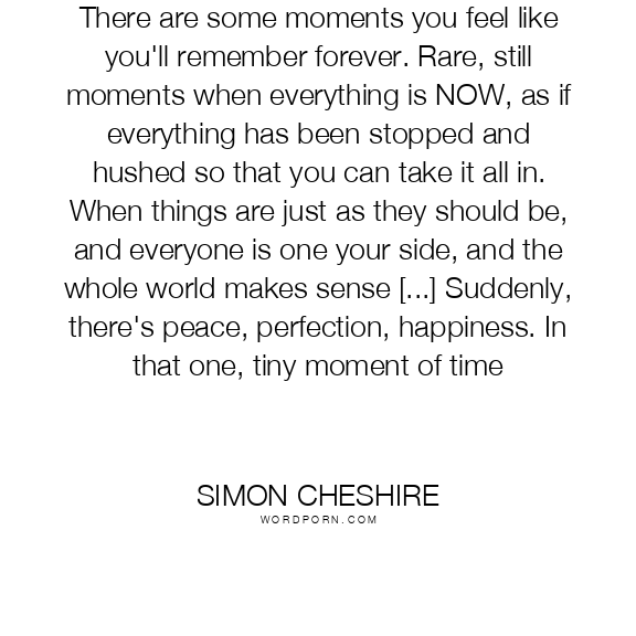 There are some moments you feel like you'll remember forever. Rare, still moments when everything is NOW, as if everything has been stopped and hushed so that you can take it all in. When things are just as they should be, and everyone is one your side, and the whole world makes sense [...] Suddenly, there's peace, perfection, happiness. In that one, tiny moment of time