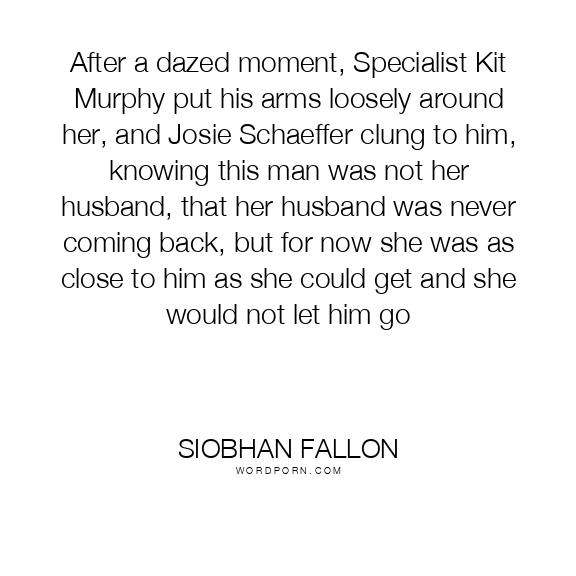 After a dazed moment, Specialist Kit Murphy put his arms loosely around her, and Josie Schaeffer clung to him, knowing this man was not her husband, that her husband was never coming back, but for now she was as close to him as she could get and she would not let him go